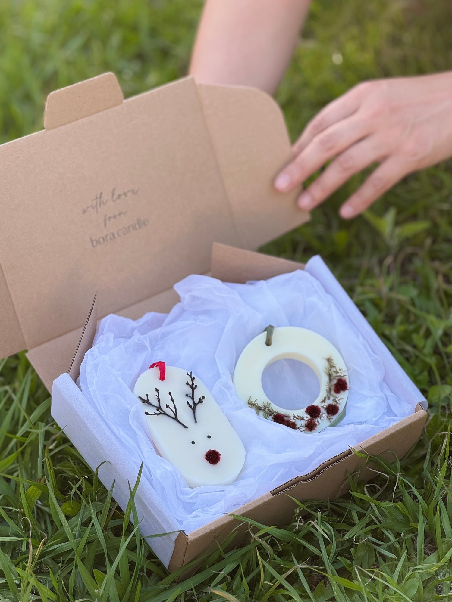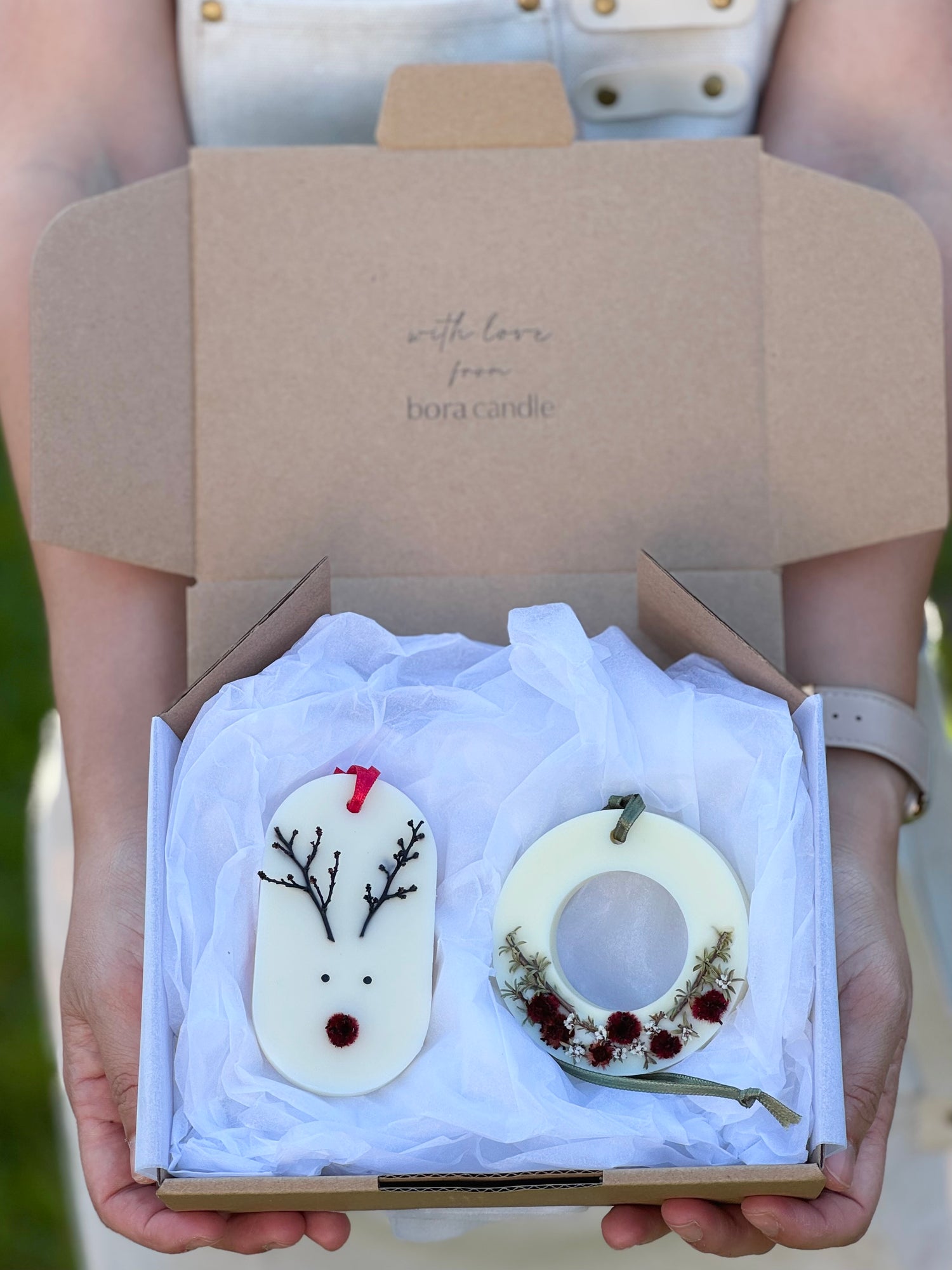 Our Christmas gift set includes two wax tablet diffusers with dried flowers, blending natural ingredients and exquisite fragrances. Thoughtfully packaged, it’s the ideal gift for someone special or a luxurious treat for yourself, bringing harmony and fragrance to any room.
